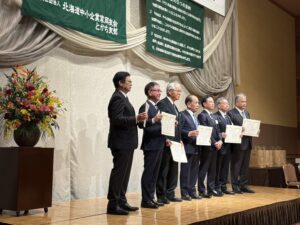11月14日、北海道ホテルにて開催されました北海道中小企業家同友会とかち支部 設立50周年記念式典・祝賀会に、しりべし・小樽支部長として来賓出席させていただきました。成田孔一支部長の力強いご挨拶に始まり、長きにわたり支部を牽引してこられた歴代支部長の皆様への表彰など、半世紀の重みと輝かしい歴史を感じる、大変厳粛で感動的な式典でした。記念講演では、株式会社中川政七商店の前会長・中川淳様より「すべてはビジョンから始まる!〜創業300年超の老舗を再生!前会長が伝えたい企業の生き残る道〜」と題し、示唆に富むお話を拝聴しました。企業の永続性におけるビジョンの重要性は、私たち同友会が最も大切にする「経営指針」の理念そのものであり、改めてその意義を深く胸に刻む機会となりました。祝賀会では、とかち支部の皆様の熱気とエネルギーに満ちた素晴らしい交流の輪に参加させていただき、大きな刺激をいただきました。特に印象的だったのは、一皿ごとに原材料の生産者が登壇またはインタビュー動画に登場し、生産や加工にかける熱い想いを語ってくださったことです。これは、日頃から農業・酪農に携わっている会員同士の切磋琢磨の賜物だと感じました。この50年の歩みは、まさしく同友会の三つの目的である「よい会社」「よい経営者」「よい経営環境」を、十勝の地で実践されてきた歴史そのものです。初代の長谷川晃三支部長をはじめとする歴代支部長、そして在籍50年を超える企業の皆様をはじめ、この輝かしい歴史を築き上げてこられたすべての会員の皆様に、心からの敬意を表します。私たちしりべし・小樽支部も、とかち支部の皆様からいただいたこの素晴らしい刺激を力に変え、地域経済の発展に貢献すべく、より一層活動に邁進してまいります。とかち支部の今後ますますのご発展と、会員皆様のさらなるご活躍を心より祈念申し上げます。誠におめでとうございました!